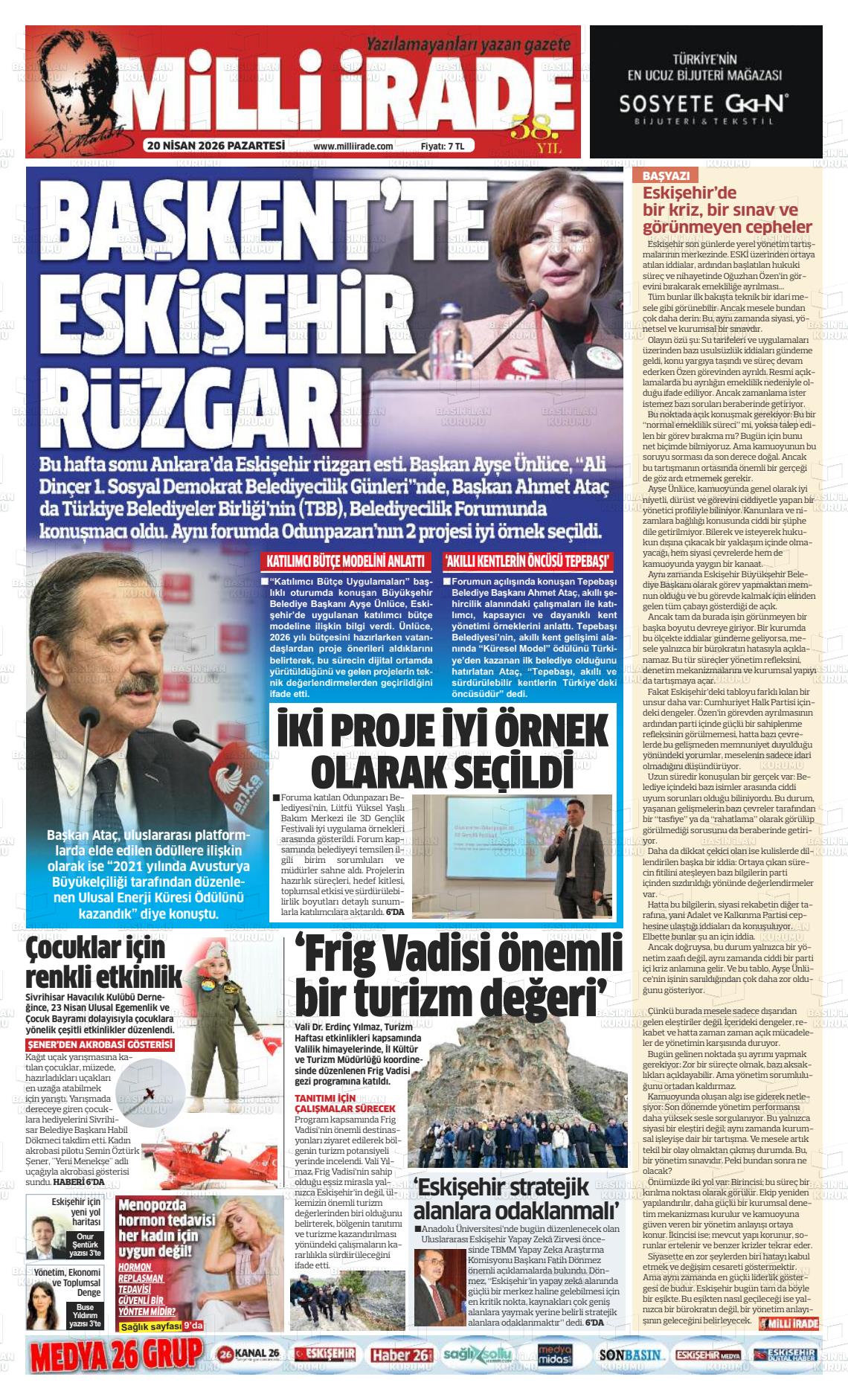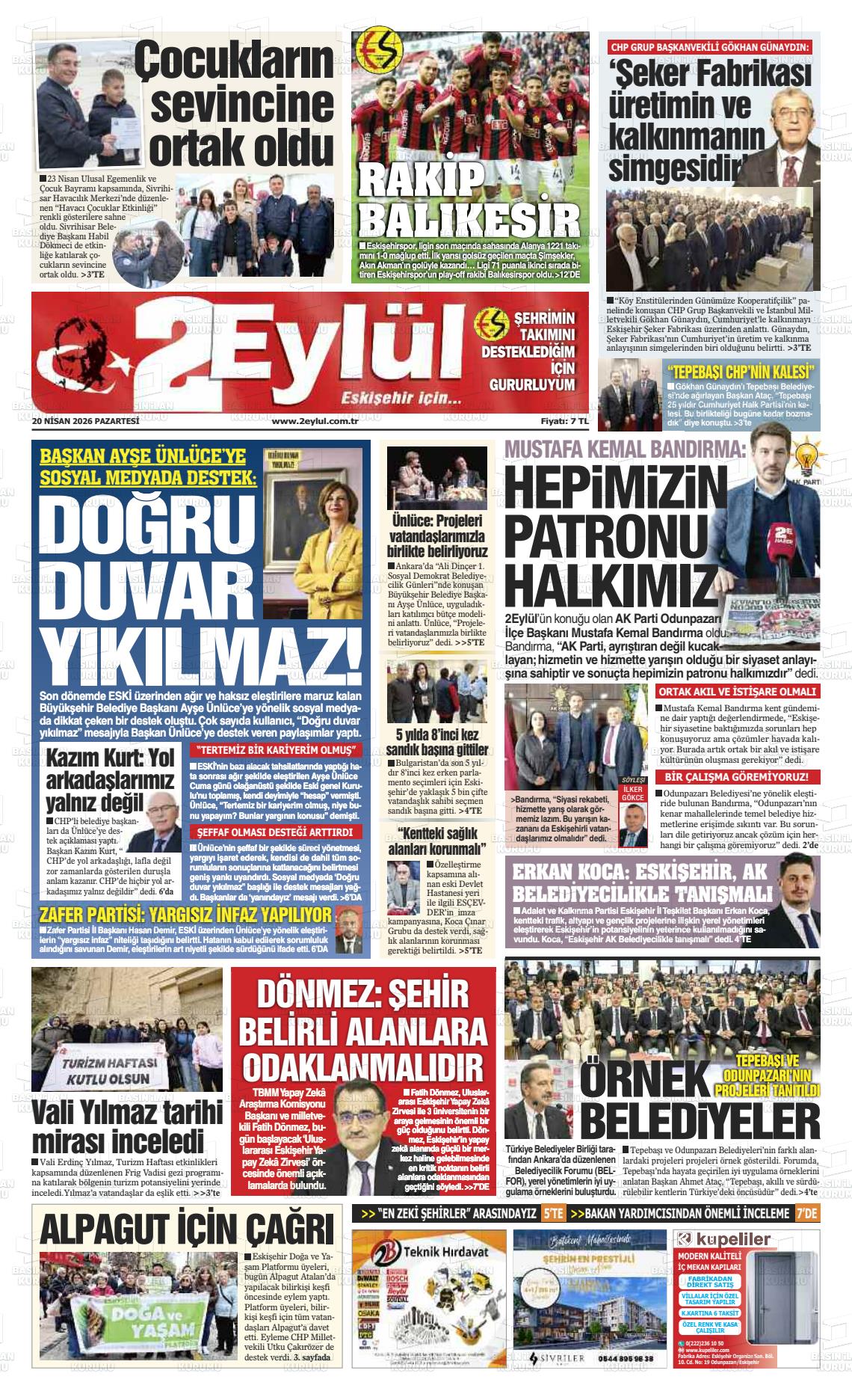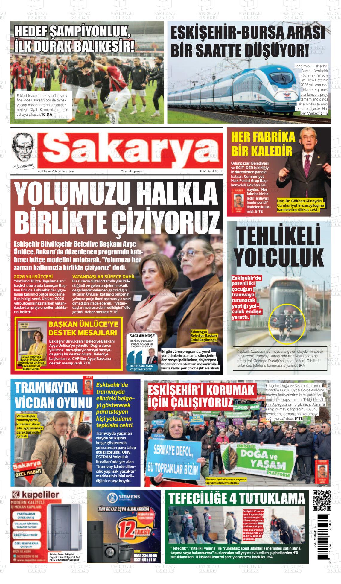 Eskİşehİr Yerel Gazeteleri 20 Nisan 2026, Pazartesi Günü Manşeti